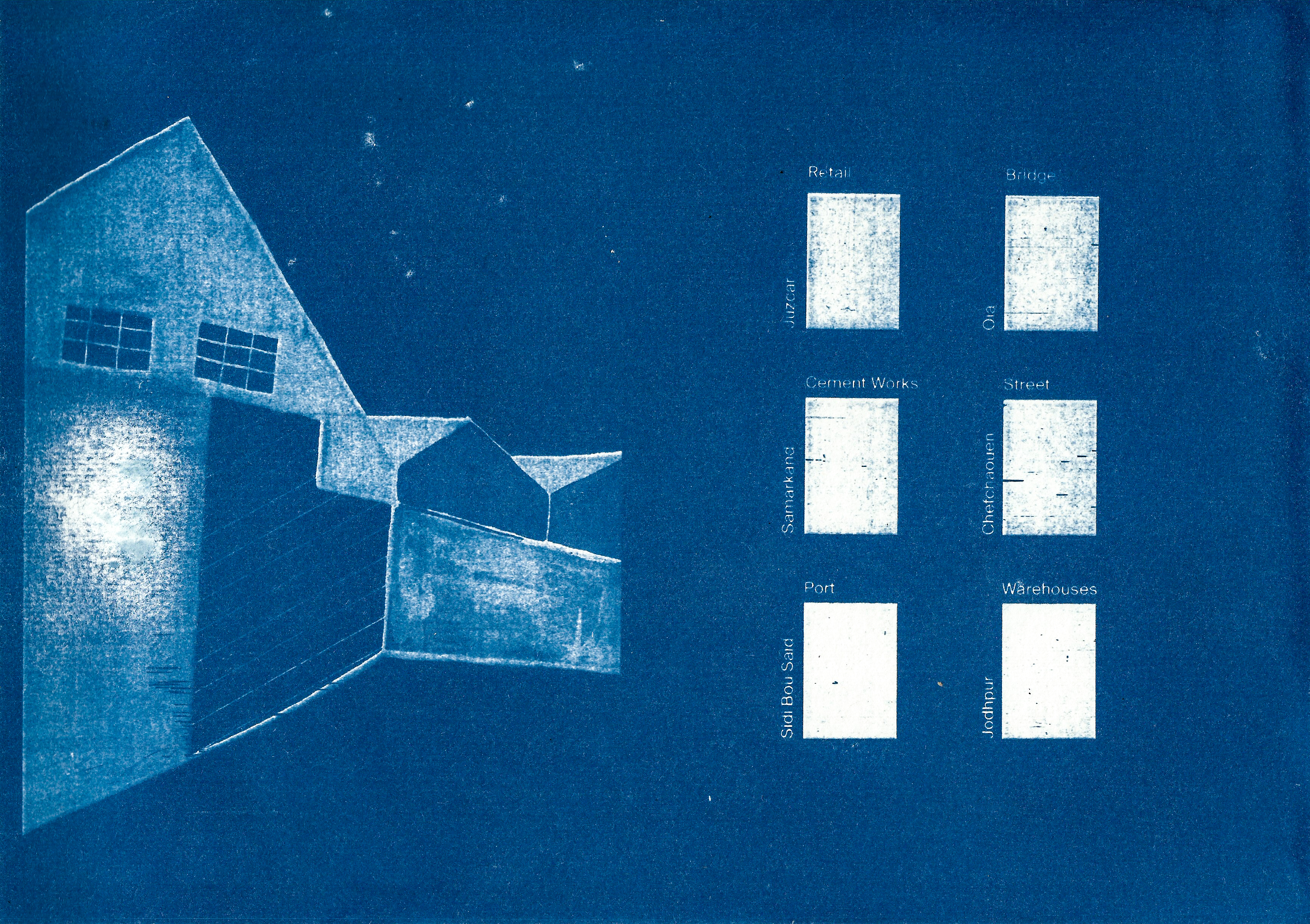 Edition of 18 Cyanotypes with digitally printed stamps made from mixed media drawings.